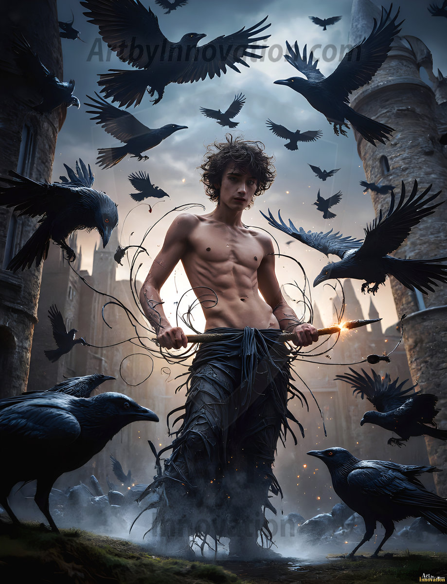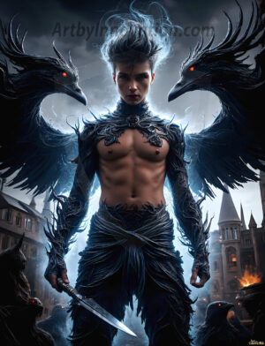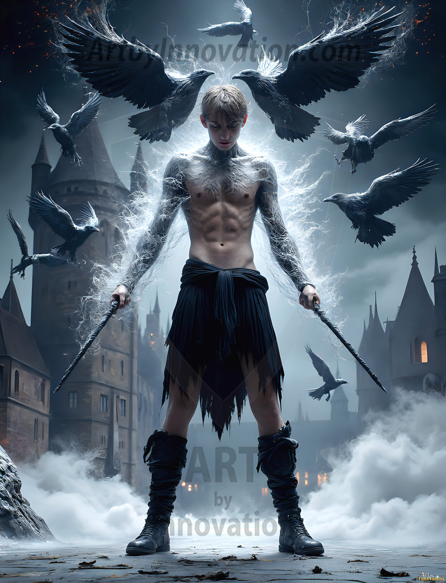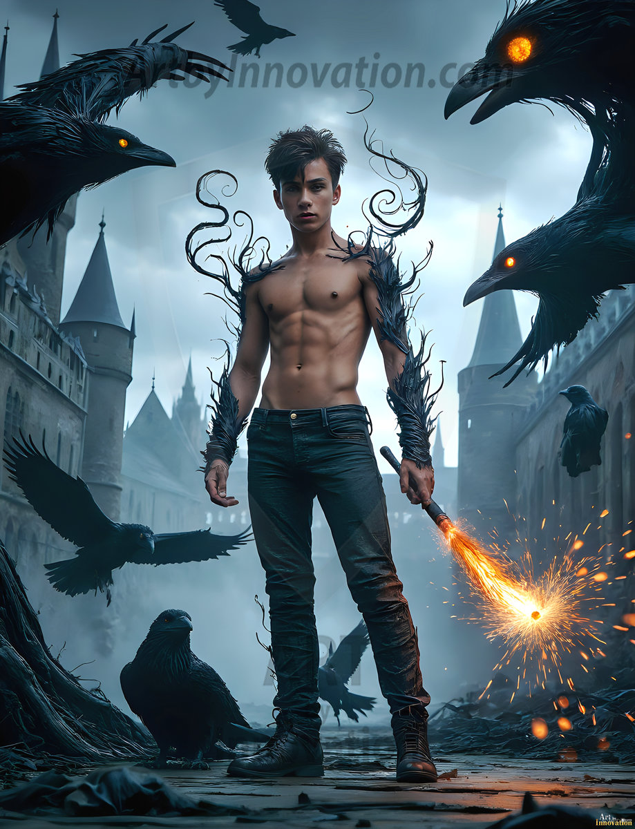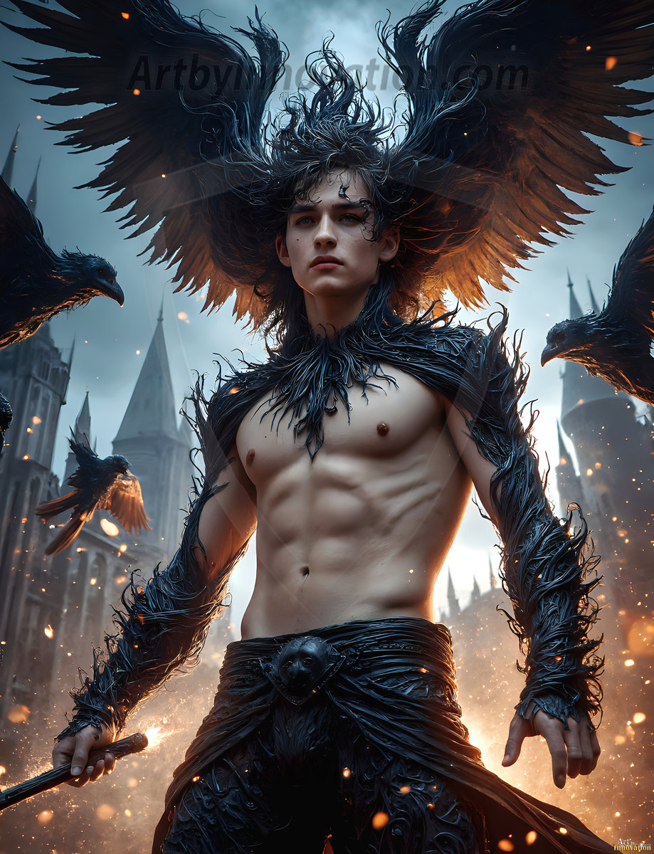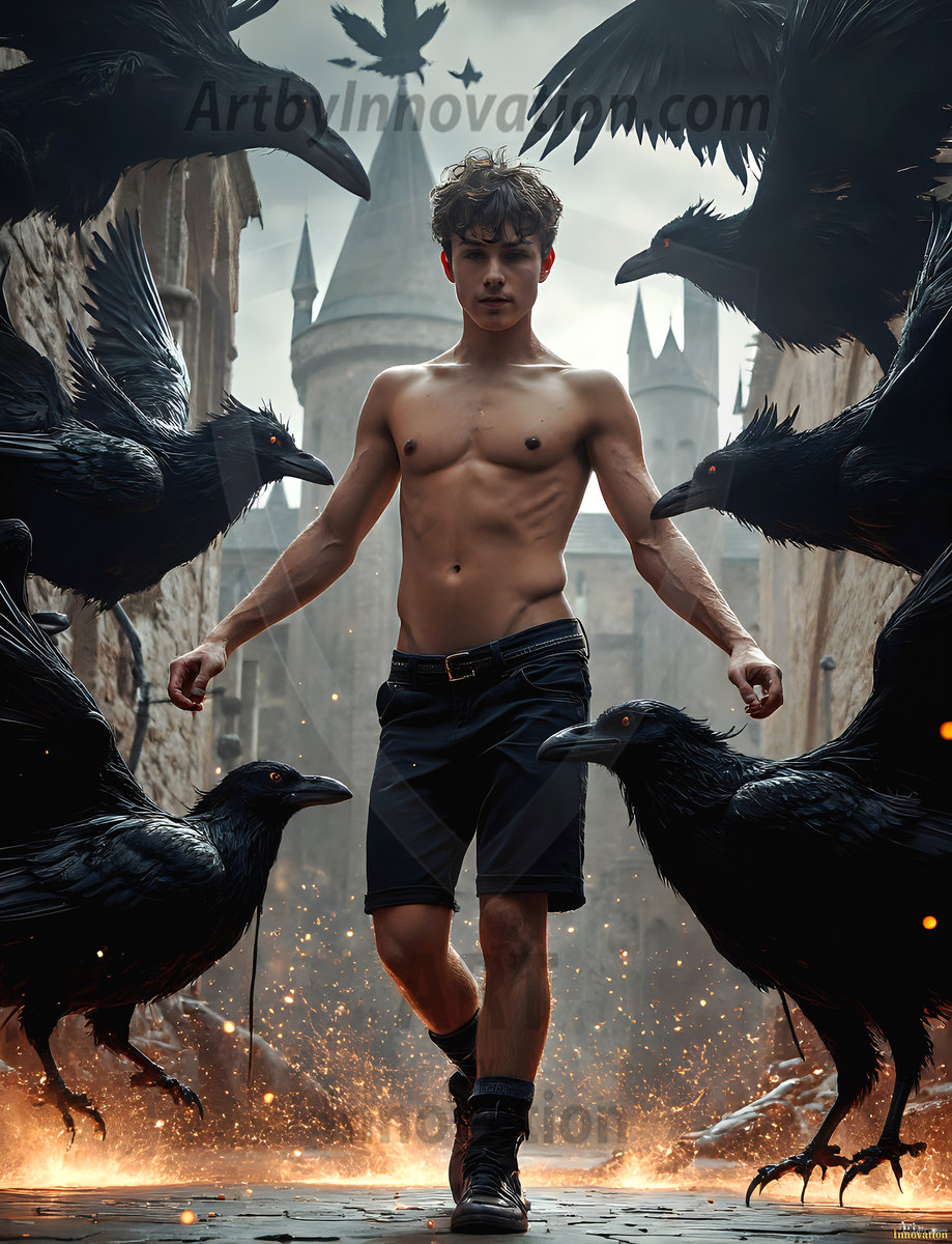 Handsome AI-generated Hufflepuff wizards conjuring fierce loyal badgers at Hogwarts — earthy magic, cinematic lighting.