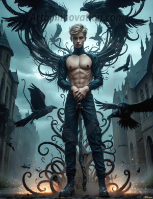 Handsome AI-generated male warrior angels in divine holy armor with vibrant wings — God’s warriors in the golden city of heaven.