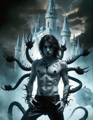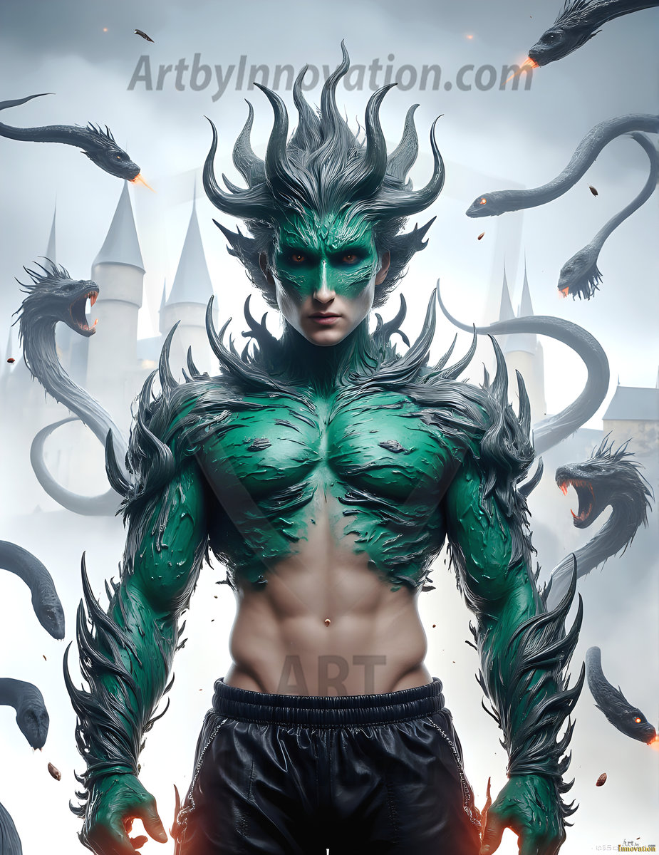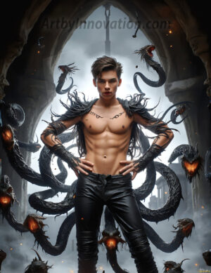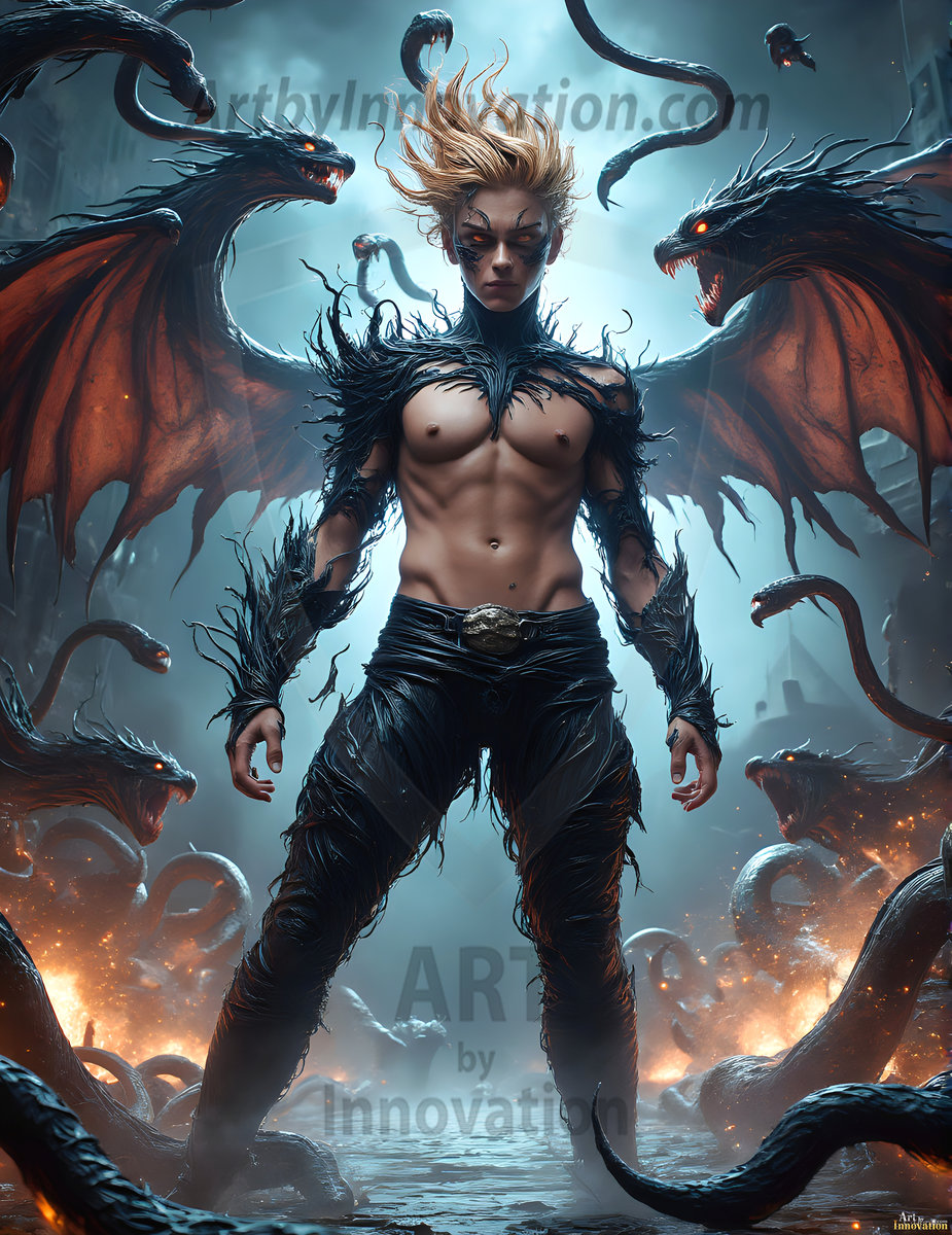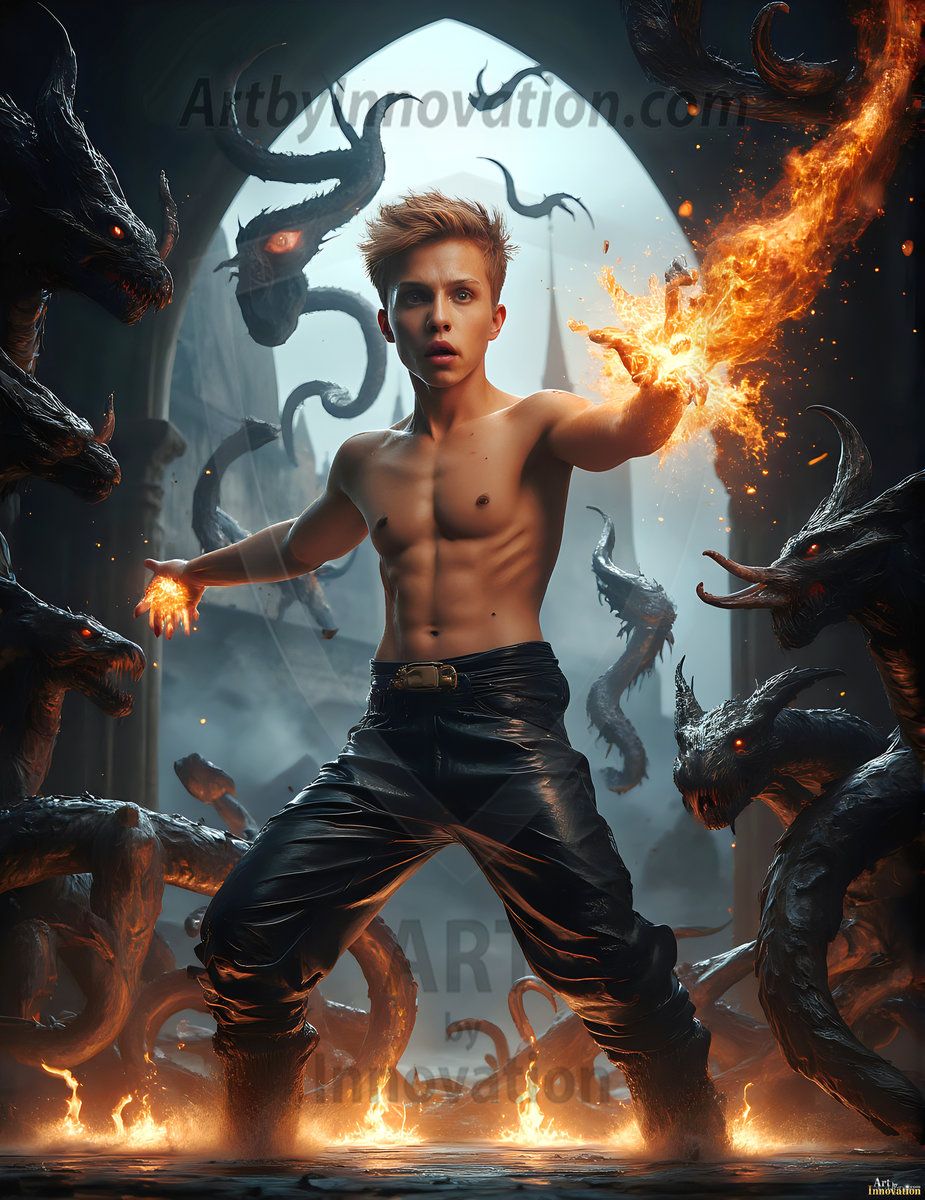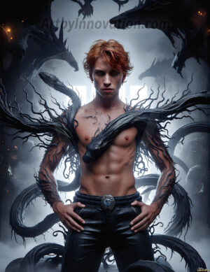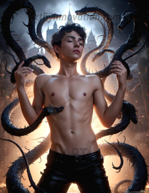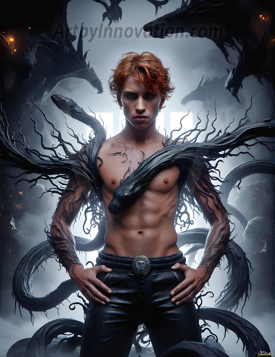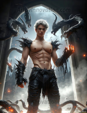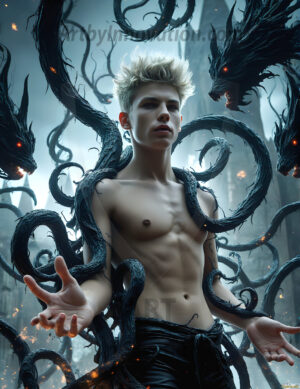 AI-generated abstract art — handsome men controlling swirling vortexes of vibrant colorful fluid and water in motion.