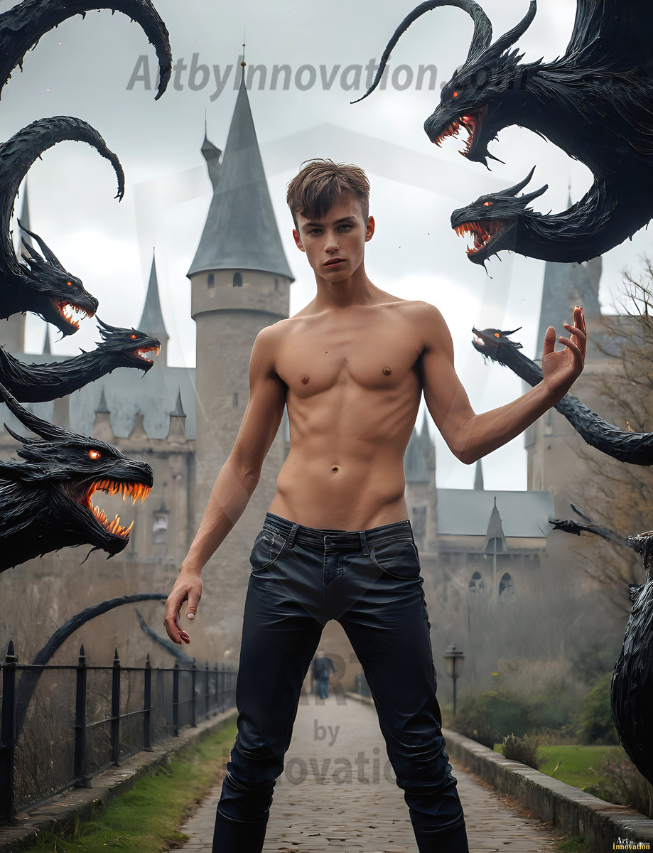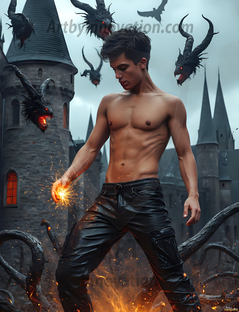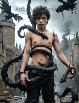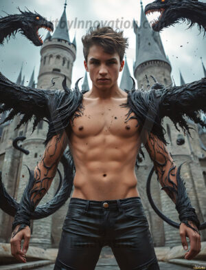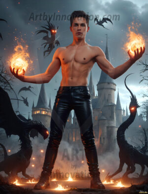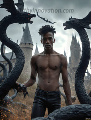 Handsome AI-generated Ravenclaw wizards summoning massive protective ravens at Hogwarts — wisdom, power, and dark beauty.