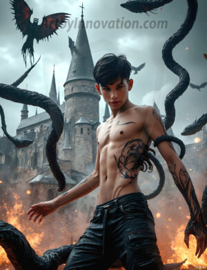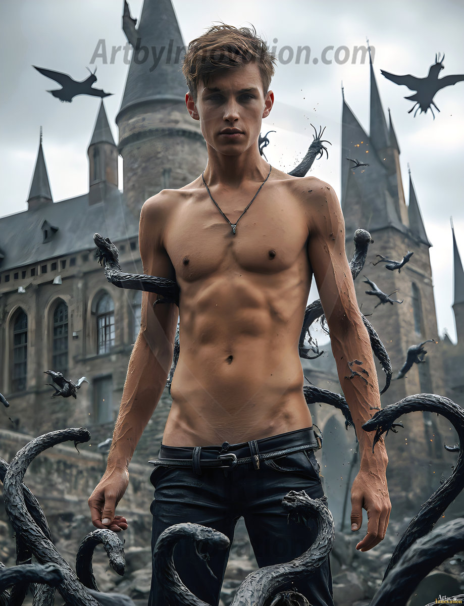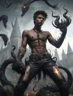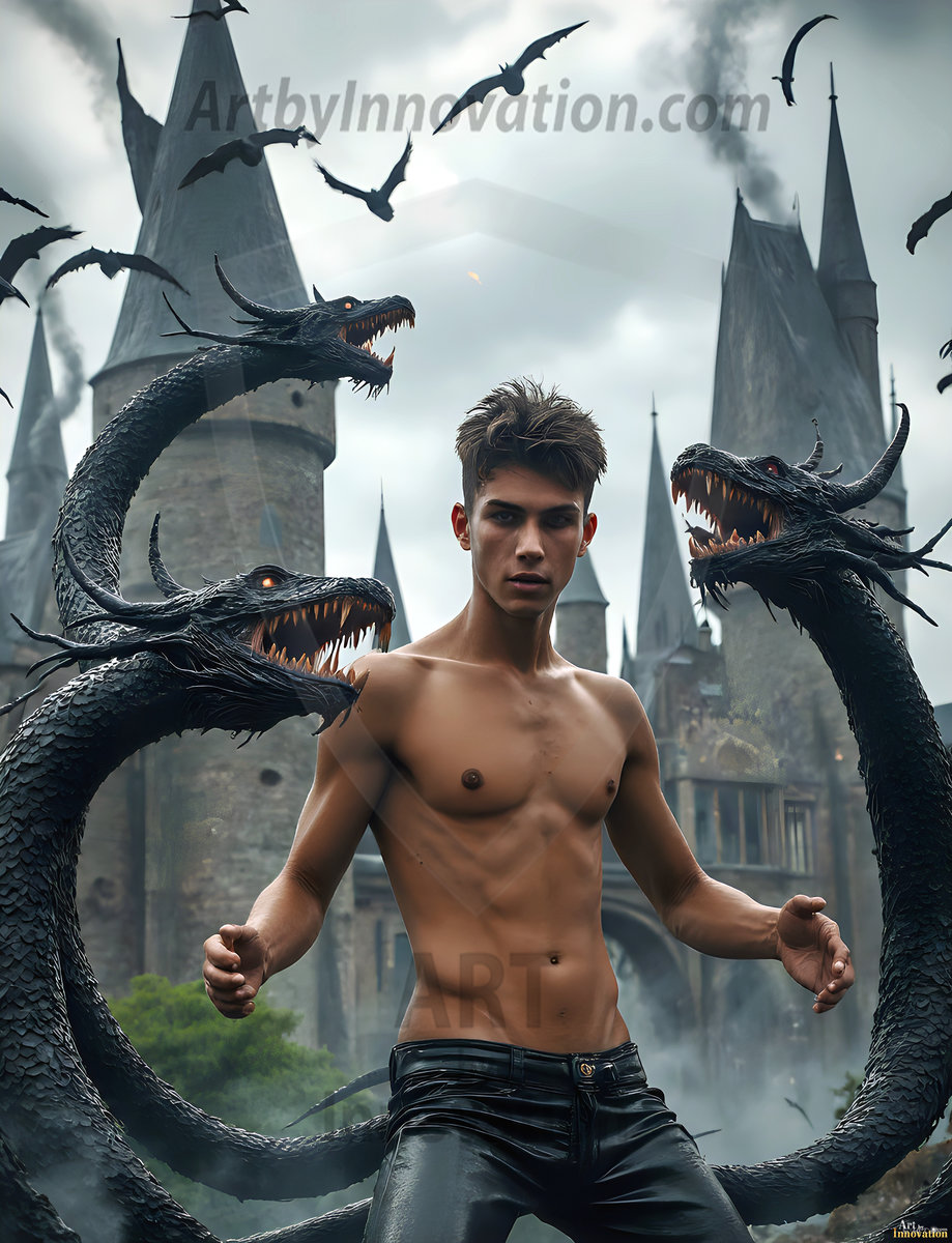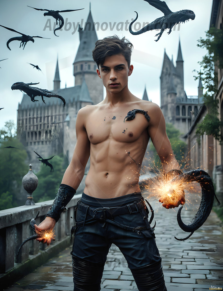 Handsome AI-generated Gryffindor wizards conjuring lions at Hogwarts castle — brave, powerful, and strikingly beautiful.