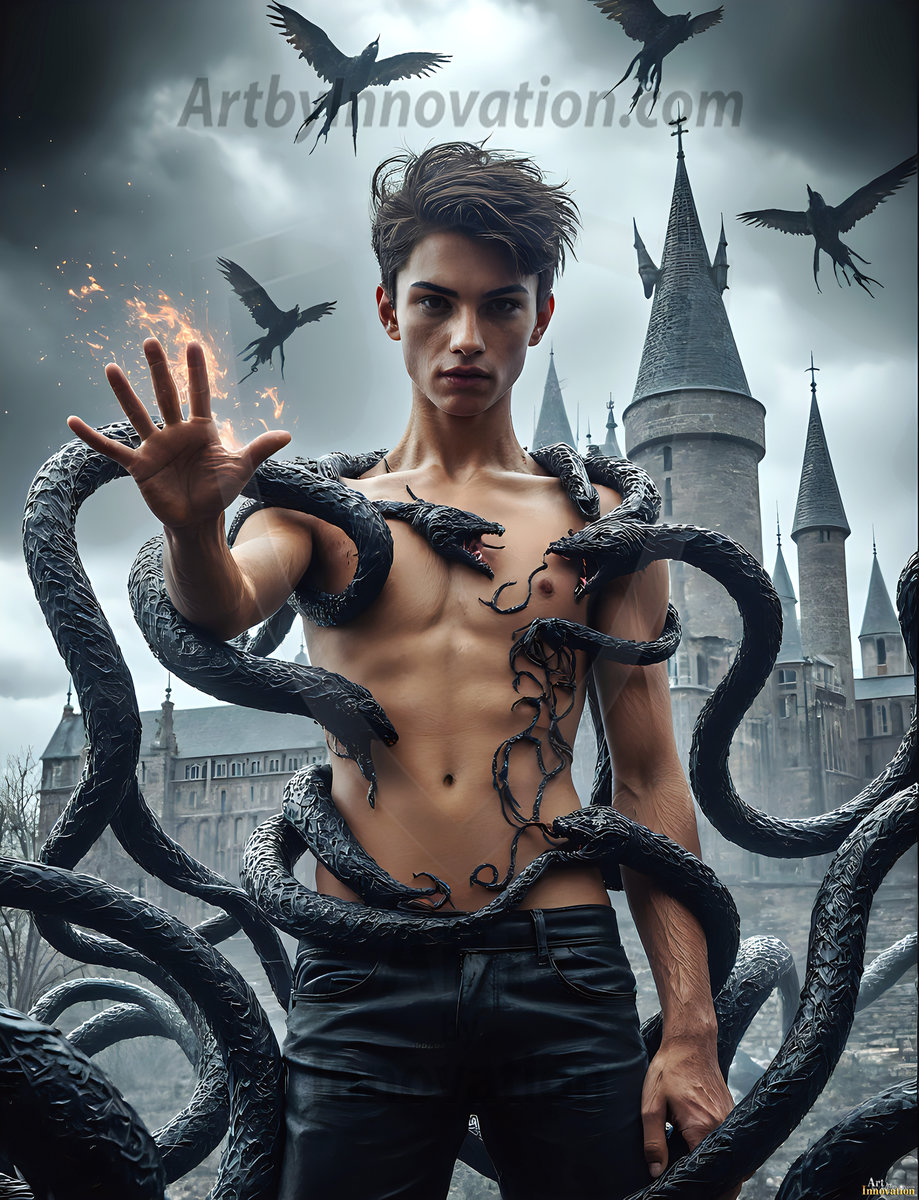 Handsome AI-generated Ravenclaw wizards summoning massive protective ravens at Hogwarts — wisdom, power, and dark beauty.