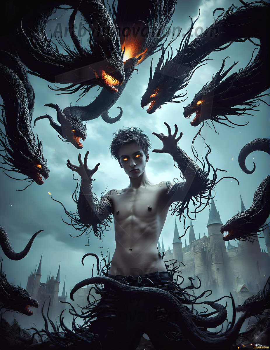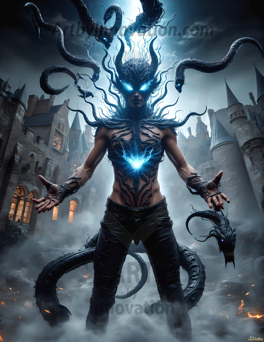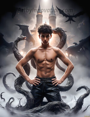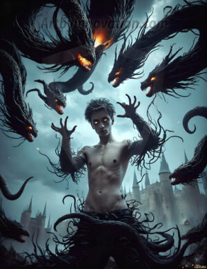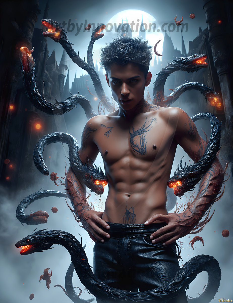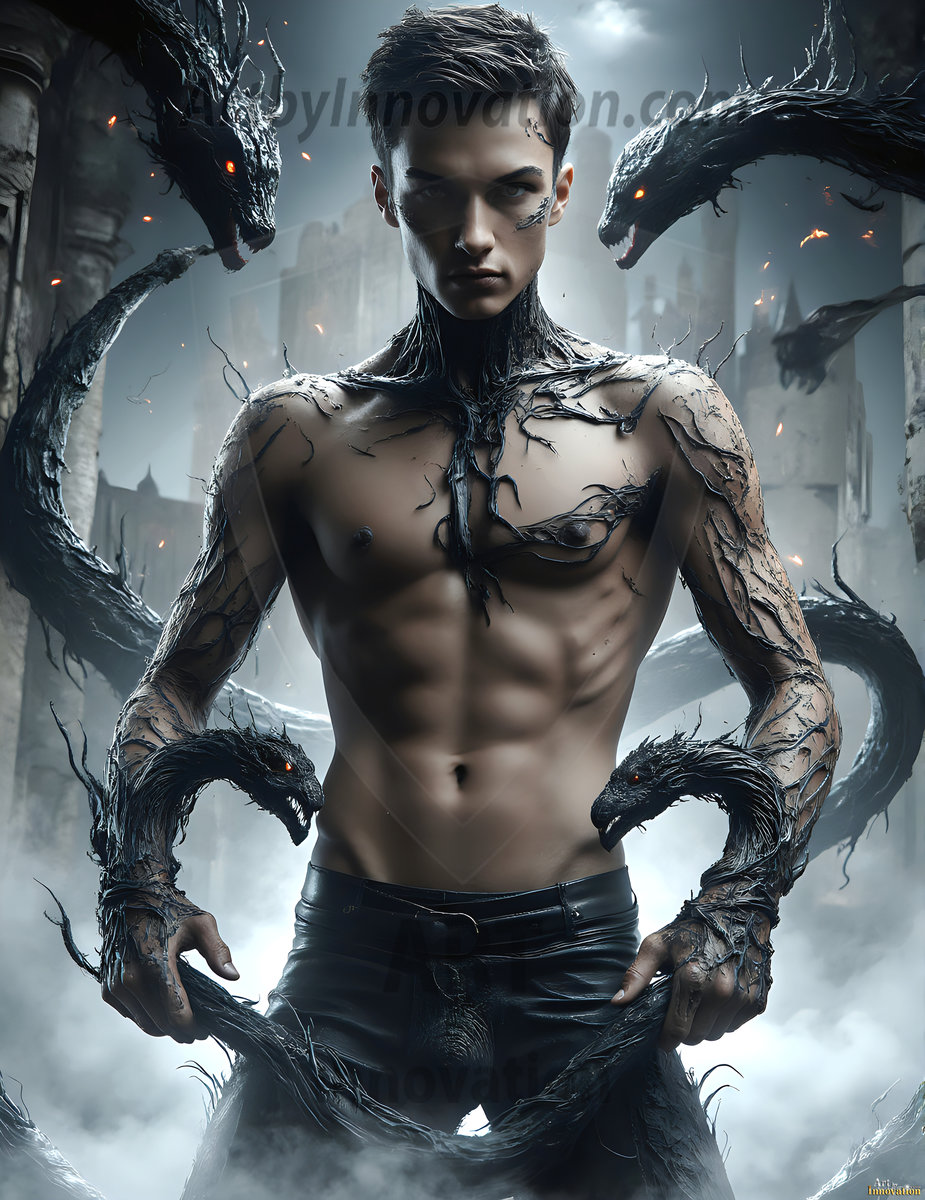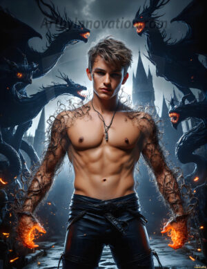 AI-generated hot male demons with dark wings and glowing eyes — handsome, dangerous, and seductive from the ruins of hell.