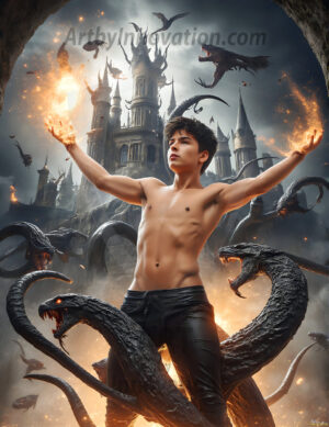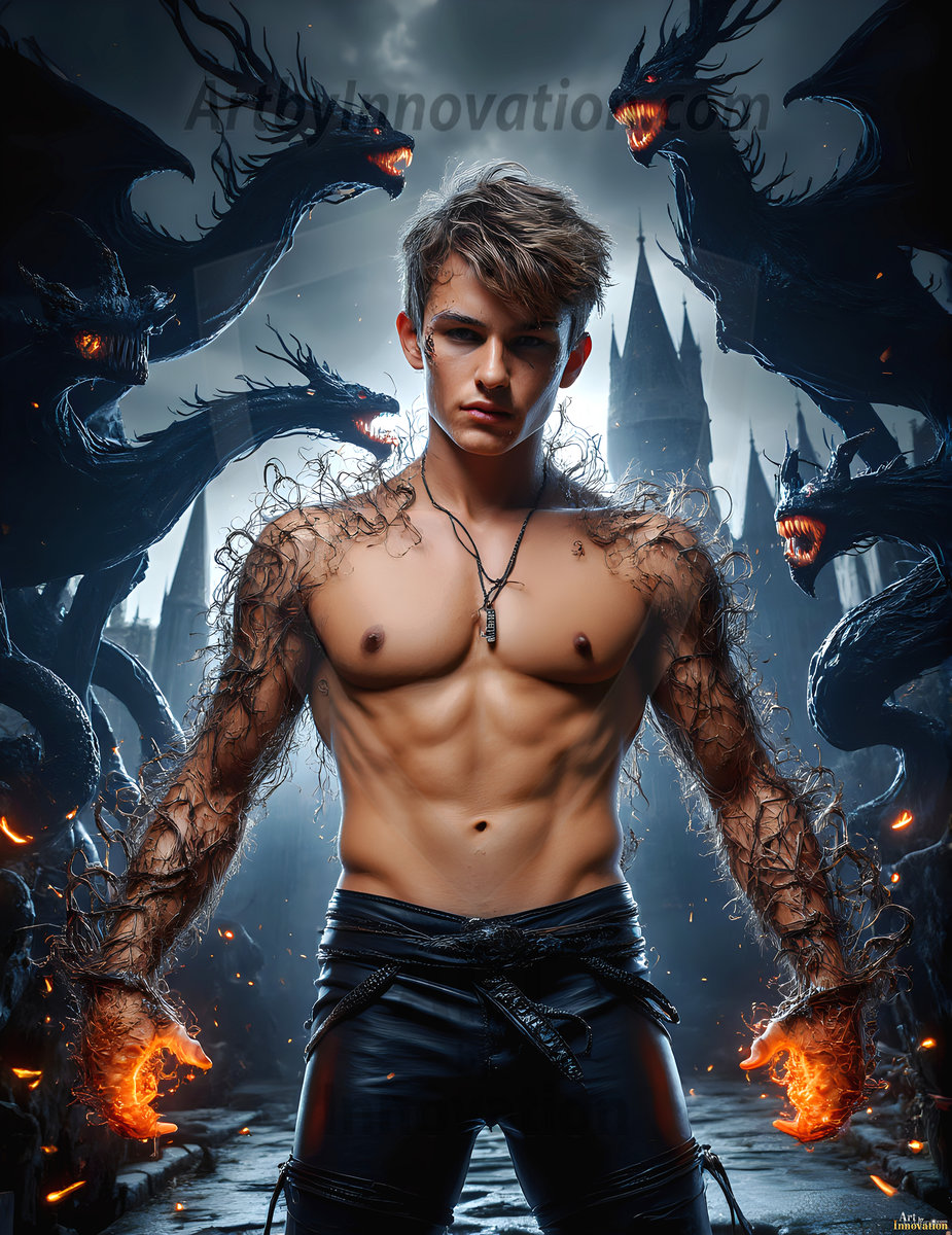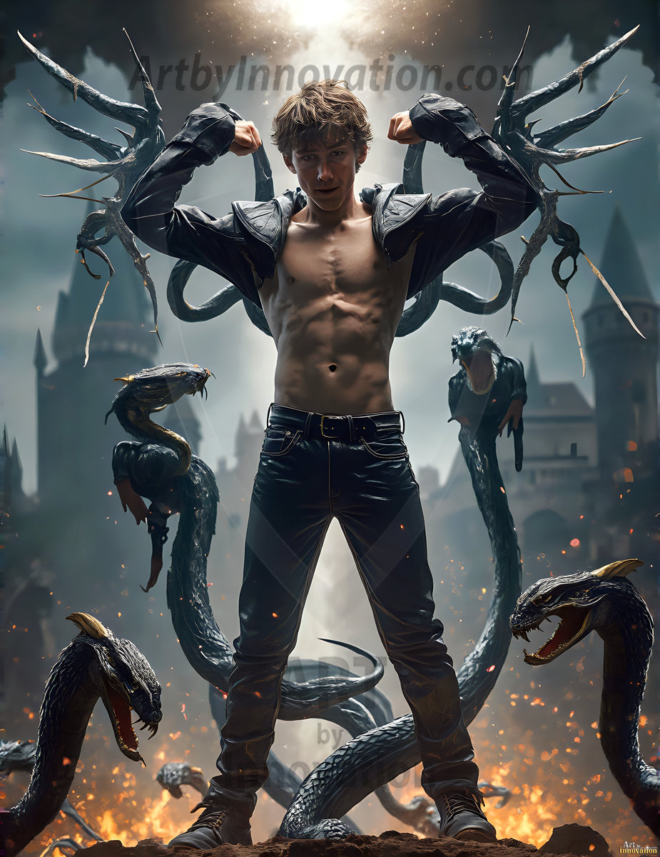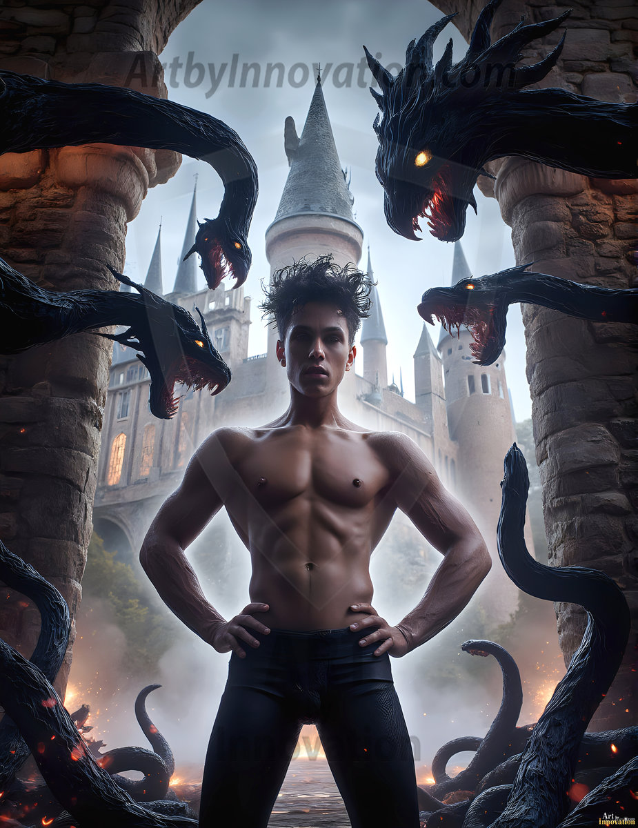 Handsome AI-generated Gryffindor wizards conjuring lions at Hogwarts castle — brave, powerful, and strikingly beautiful.